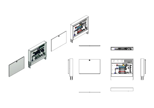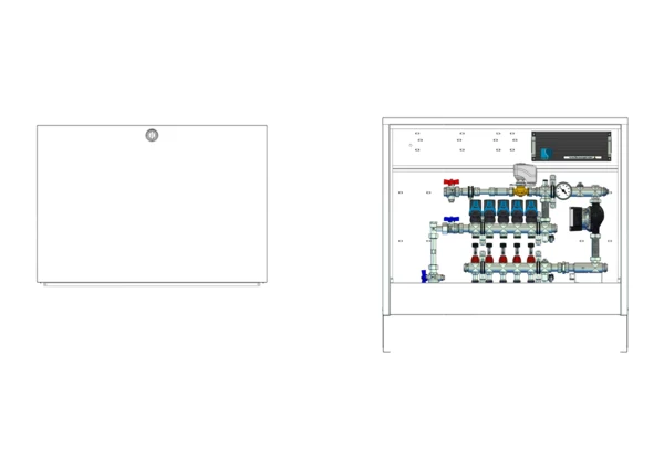 strawa Comfort Mischstation FBM-18-V-WMZ-CA-EGO 5 Hkr.,BxHxT: 882x710x125 mm, Mischg. m 3P SM mit Pumpe, vert. AG m. WMZ, Verteiler mit DFA min/max + THV f. EGO, vorm. EGO-Regel. + Klemml. m. Vorverdr., Comfort-AP-Schrank in RAL 9016