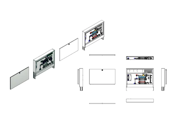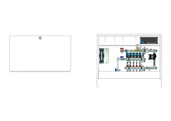 Die Mischstation für Flächenheizung ist mit einer witterungsgeführten Vorlauf-Temperaturregelung (Regler nicht im Lieferumfang) ausgestattet. Die im Aufputzschrank montierte Mischgruppe umfasst eine Umwälzpumpe, einen Edelstahlverteiler mit absperrbaren Durchflussanzeigern und Ventileinsätzen für EGO-Schnellverschluss, sowie eine horizontale Anschlussgarnitur mit Wärmezählerverrohrung. Zusaätzlich ist eine Wasserzählereinbaustrecke für Trinkwasser kalt vorhanden. Die vormontierten und verdrahteten EGO-Regelantriebe sind auf einer montierten Klemmleiste installiert.