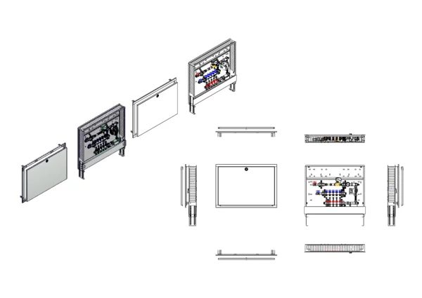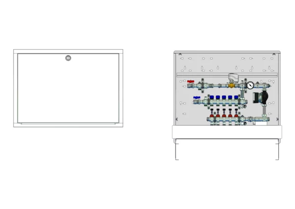 strawa Comfort Kompakt-Mischstation FBM-63-HT1-H-C69 5 Hkr.,BxHxT: 900x775x122 mm, Mischg. m 3P SM mit Pumpe, 1x Hochtemperaturabgang, horz. AG o. WMZ, Verteiler mit DFA 0-3 l/min + THV M30x1,5, Comfort-UP-Schrank m. Frontbl. RAL 9016