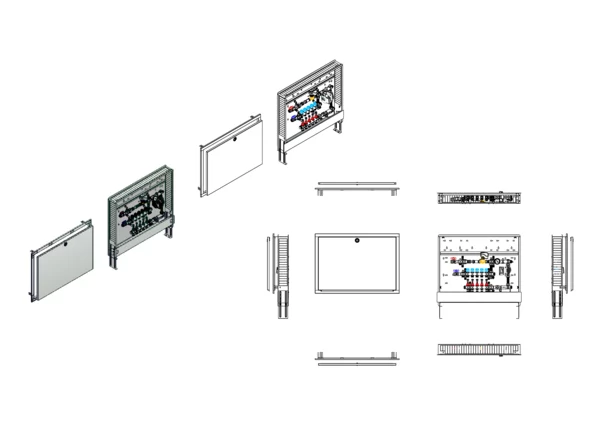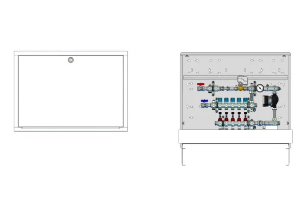 Kompakt-Mischstation für Flächenheizung mit witterungsgeführter Vorlauf-Temperaturregelung (Regler nicht im Lieferumfang) und Hochtemperaturabgang für statische Heizfläche (z.B. Badheizkörper). Die im Unterputzschrank montierte Mischgruppe verfügt über eine Umwälzpumpe, einen Edelstahlverteiler mit absperrbaren Durchflussanzeigern und Ventileinsätzen für den EGO-Schnellverschluss, sowie eine horizontale Anschlussgarnitur ohne Wärmezählerverrohrung. Es ist zudem eine Platzhaltung für die Klemmleiste und EGO-Regelantriebe vorgesehen.