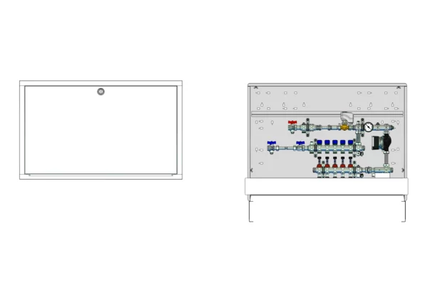strawa Comfort Kompakt-Mischstation FBM-63-HT1-H-WMZ-C69 5 Hkr.,BxHxT: 1050x775x122 mm, Mischg. m 3P SM mit Pumpe, 1x Hochtemperaturabgang, horz. AG m. WMZ, Verteiler mit DFA 0-3 l/min + THV M30x1,5, Comfort-UP-Schrank m. Frontbl. RAL 9016