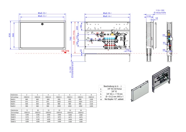 Die Kompakt-Mischstation für Flächenheizung verfügt über eine witterungsgeführte Vorlauf-Temperaturregelung (Regler nicht im Lieferumfang) und einen Hochtemperaturabgang für statische Heizflächen, wie Badheizkörper. Die Mischgruppe ist im Unterputzschrank montiert und enthält eine Umwälzpumpe, einen Edelstahlverteiler mit absperrbaren Durchflussanzeigern und Ventileinsätzen für den EGO-Schnellverschluss. Zudem ist eine horizontale Anschlussgarnitur mit Wärmezählerverrohrung integriert. Es sind Platzhaltungen für eine Wasserzählereinbaustrecke, eine Klemmleiste und EGO-Regelantriebe vorgesehen.