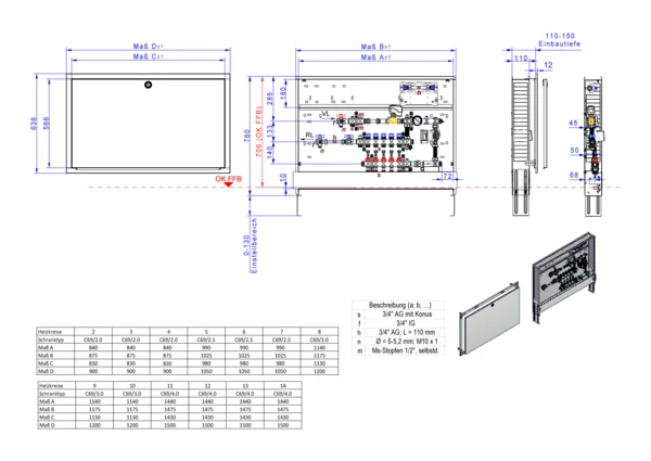 Die Kompakt-Mischstation für Flächenheizung ist mit einer witterungsgeführten Vorlauf-Temperaturregelung ausgestattet (Regler nicht im Lieferumfang) und bietet einen Hochtemperaturabgang für statische Heizflächen (z.B. Badheizkörper). Die im Unterputzschrank montierte Mischgruppe umfasst eine Umwälzpumpe, einen Edelstahlverteiler mit regulierbaren Durchflussanzeigern und Ventileinsätzen (M30x1,5), sowie eine horizontale Anschlussgarnitur mit Wärmezählerverrohrung. Zusätzlich ist eine Wasserzählereinbaustrecke für Trinkwasser kalt vorhanden, und es gibt Platzhaltungen für die Klemmleiste und Stellantriebe.