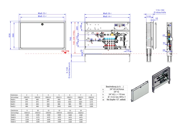Kompakt-Mischstation für Flächenheizung mit witterungsgeführter Vorlauf-Temperaturregelung (Regler nicht im Lieferumfang) und Hochtemperaturabgang für statische Heizfläche (z.B. Badheizkörper). Die im Unterputzschrank montierte Mischgruppe enthält eine Umwälzpumpe, Edelstahlverteiler mit absperrbarem Durchflussanzeigern und Ventileinsätzen für EGO-Schnellverschluss, horizontale Anschlussgarnitur mit Wärmezählerverrohrung, Wasserzählereinbaustrecke für Trinkwasser kalt, Platzhaltung für Klemmleiste und EGO-Regelantriebe.