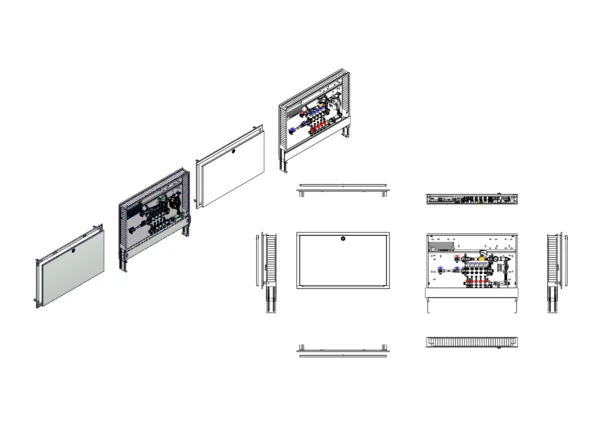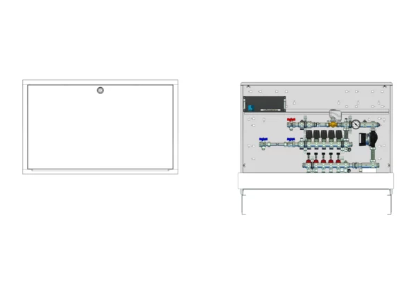 Die Kompakt-Mischstation für Flächenheizung ist mit einer witterungsgeführten Vorlauf-Temperaturregelung ausgestattet (Regler nicht im Lieferumfang) und bietet einen Hochtemperaturabgang für statische Heizflächen (z.B. Badheizkörper). Die im Unterputzschrank montierte Mischgruppe umfasst eine Umwälzpumpe, einen Edelstahlverteiler mit regulierbaren Durchflussanzeigern und Ventileinsätzen (M30x1,5), sowie eine horizontale Anschlussgarnitur mit Wärmezählerverrohrung. Die vormontierten und verdrahteten Stellantriebe sind auf einer montierten Klemmleiste installiert und es ist eine Platzhaltung für eine Wasserzählereinbaustrecke vorhanden.