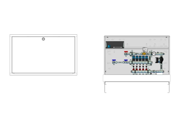 strawa Comfort Kompakt-Mischstation FBM-18-HT1-H-WMZ-C69-EGO 5 Hkr.,BxHxT: 1050 x 775 x 122 mm, Mischg. m 3P SM m Pumpe, 1x HT-Abg, horz. AG m. WMZ, Verteiler m. DFA min/max+THV für EGO, vorm. EGO-Regel., CUP-Schrank RAL 9016