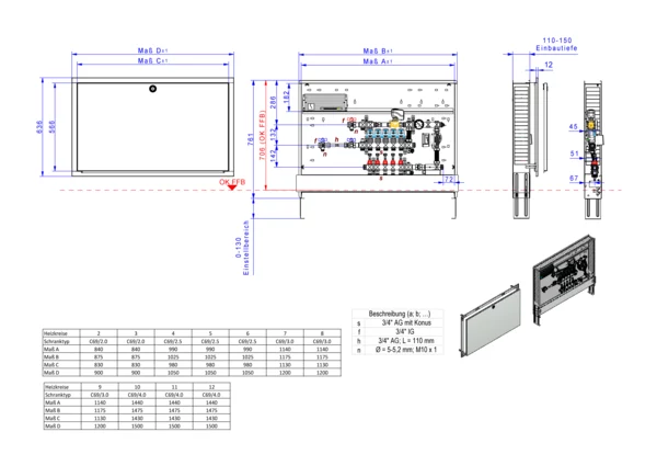 Kompakt-Mischstation für Flächenheizung: Die Station ermöglicht eine witterungsgeführte Vorlauf-Temperaturregelung (Regler nicht im Lieferumfang) und Hochtemperaturabgang für statische Heizflächen (z.B. Badheizkörper) Die im Unterputzschrank montierte Mischgruppe enthält eine Umwälzpumpe, einen Edelstahlverteiler mit absperrbarem Durchflussanzeigern und Ventileinsätzen für EGO-Schnellverschluss. Zudem ist eine horizontale Anschlussgarnitur mit Wärmezählerverrohrung integriert. Die vormontierten und verdrahteten EGO-Regelantriebe sind auf vormontierten Klemmleiste installiert. Es ist eine Platzhaltung für Wasserzählereinbaustrecke vorgesehen.