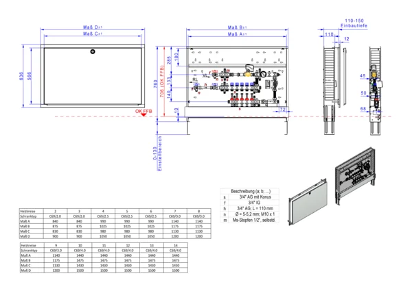 Die Kompakt-Mischstation für Flächenheizung ist mit einer witterungsgeführten Vorlauf-Temperaturregelung ausgestattet (Regler nicht im Lieferumfang) und bietet zwei Hochtemperaturabgänge für statische Heizflächen (z.B. Badheizkörper). Die im Unterputzschrank montierte Mischgruppe umfasst eine Umwälzpumpe, einen Edelstahlverteiler mit regulierbaren Durchflussanzeigern und Ventileinsätzen (M30x1,5), sowie horizontale Anschlussgarnitur mit Wärmezählerverrohrung. Es sind Platzhaltungen für Wasserzählereinbaustrecken, eine Klemmleiste und Stellantriebe vorhanden.