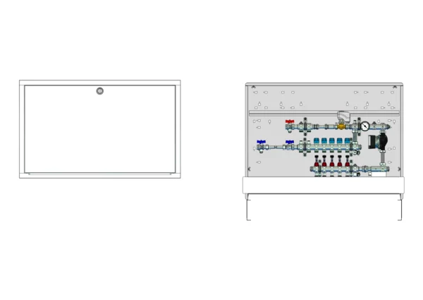 Die Kompakt-Mischstation für Flächenheizung ist mit einer witterungsgeführten Vorlauf-Temperaturregelung ausgestattet (Regler nicht im Lieferumfang) und bietet zwei Hochtemperaturabgänge für statische Heizflächen (z.B. Badheizkörper). Die im Unterputzschrank montierte Mischgruppe enthält eine Umwälzpumpe, einen Edelstahlverteiler mit absperrbaren Durchflussanzeigern und Ventileinsätzen für den EGO-Schnellverschluss, sowie eine horizontale Anschlussgarnitur mit Wärmezählerverrohrung. Es gibt Platzhaltungen für Wasserzählereinbaustrecken, eine Klemmleiste und EGO-Regelantriebe.