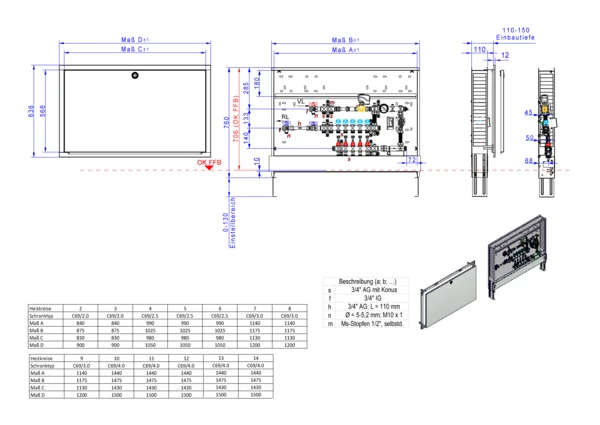 Die Kompakt-Mischstation für Flächenheizung ist mit einer witterungsgeführten Vorlauf-Temperaturregelung ausgestattet (Regler nicht im Lieferumfang) und bietet zwei Hochtemperaturabgänge für statische Heizflächen (z.B. Badheizkörper). Die im Unterputzschrank montierte Mischgruppe enthält eine Umwälzpumpe, einen Edelstahlverteiler mit absperrbaren Durchflussanzeigern und Ventileinsätzen für den EGO-Schnellverschluss, sowie eine horizontale Anschlussgarnitur mit Wärmezählerverrohrung. Es gibt Platzhaltungen für Wasserzählereinbaustrecken, eine Klemmleiste und EGO-Regelantriebe.