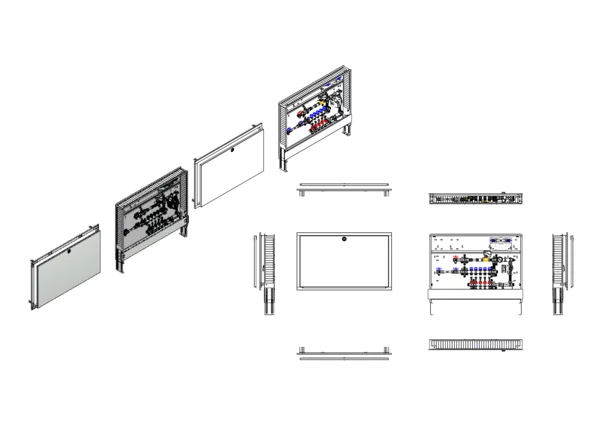 Die Kompakt-Mischstation für Flächenheizung ist mit einer witterungsgeführten Vorlauf-Temperaturregelung ausgestattet (Regler nicht im Lieferumfang) und bietet zwei Hochtemperaturabgänge für statische Heizflächen (z.B. Badheizkörper). Die im Unterputzschrank montierte Mischgruppe umfasst eine Umwälzpumpe, einen Edelstahlverteiler mit regulierbaren Durchflussanzeigern und Ventileinsätzen (M30x1,5), sowie eine horizontale Anschlussgarnitur mit Wärmezählerverrohrung. Zusätzlich ist eine Wasserzählereinbaustrecke für Trinkwasser kalt vorhanden und es gibt Platzhaltungen für eine Klemmleiste und Stellantriebe.