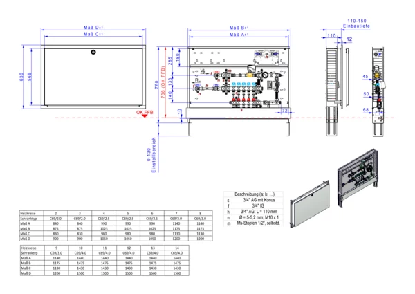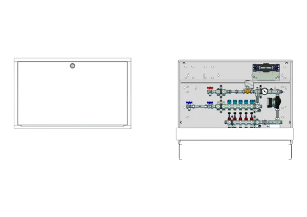 Die Kompakt-Mischstation für Flächenheizung ist mit einer witterungsgeführten Vorlauf-Temperaturregelung ausgestattet (Regler nicht im Lieferumfang) und bietet zwei Hochtemperaturabgänge für statische Heizflächen (z.B. Badheizkörper). Die im Unterputzschrank montierte Mischgruppe enthält eine Umwälzpumpe, einen Edelstahlverteiler mit absperrbaren Durchflussanzeigern und Ventileinsätzen für den EGO-Schnellverschluss, sowie eine horizontale Anschlussgarnitur mit Wärmezählerverrohrung. Zusätzlich ist eine Wasserzählereinbaustrecke für kaltes Trinkwasser vorhanden und es gibt Platzhaltungen für die Klemmleiste und EGO-Regelantriebe.
