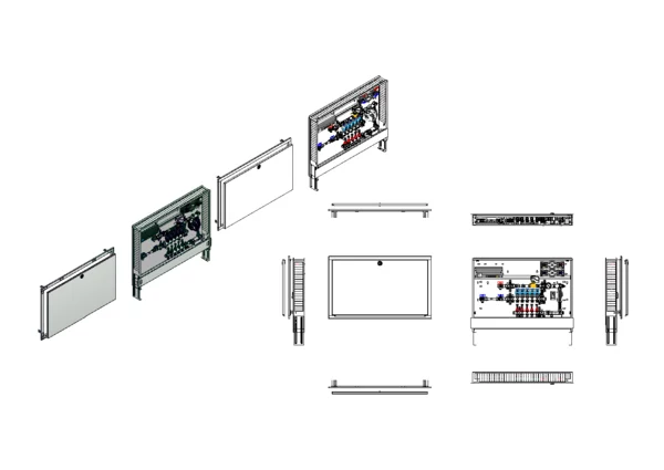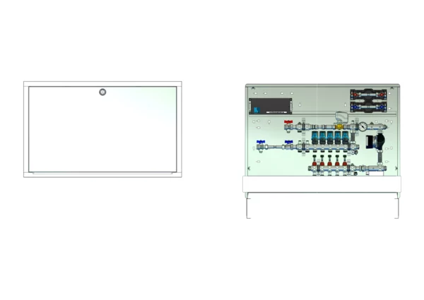 strawa Comfort Kompakt-Mischstation FBM-18-HT2-H-W2-WMZ-C69-EGO 5 Hkr.,BxHxT: 1050x775x122 mm, Mischg. m 3P SM m Pum, 2x HT-Abg, horz. AG m. WMZ, Verteiler m. DFA min/max+THV für EGO, vorm. EGO-Regelantr., WZ-TW kalt+warm, CUP-Schrank RAL9015