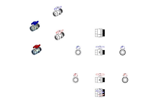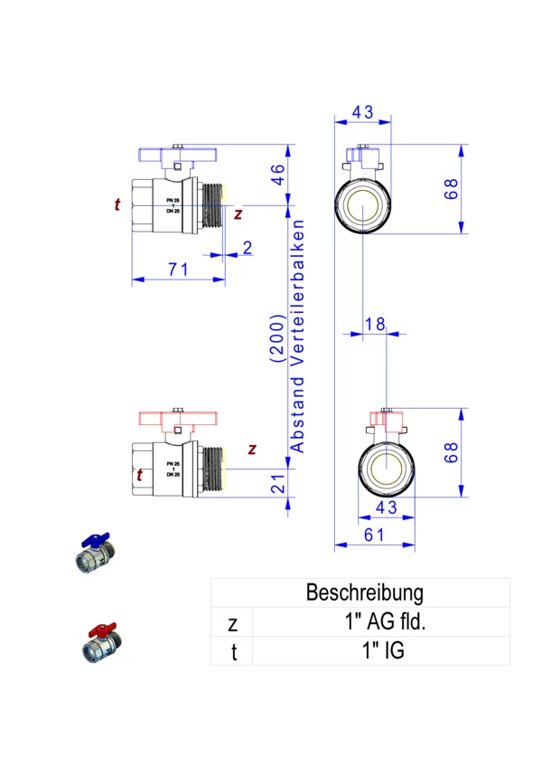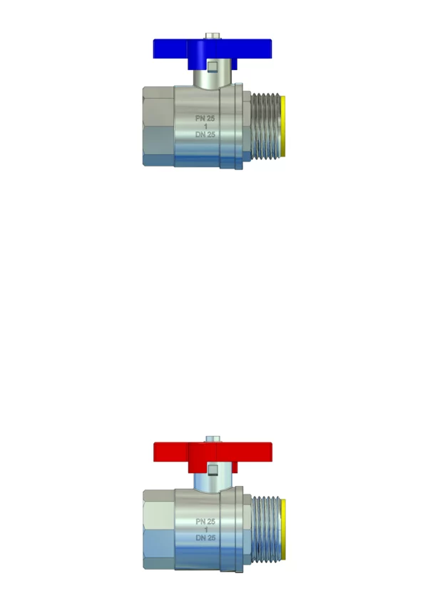 Anschlussgarnitur ohne Wärmezählerverrohrung, bestehend aus Vor- und Rücklaufkugelhahn, für den horizontalen Primäranschluss von Flächenheizungs- und Heizkörper-Anschlussverteilern.