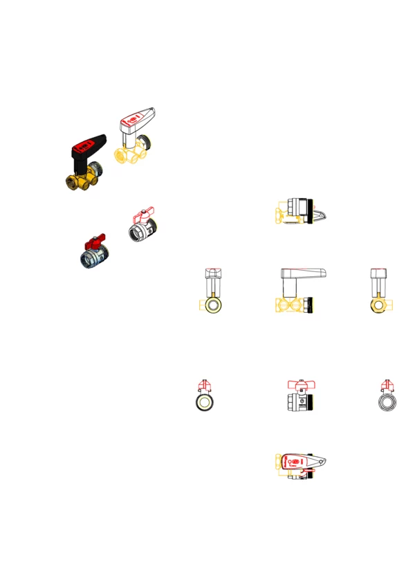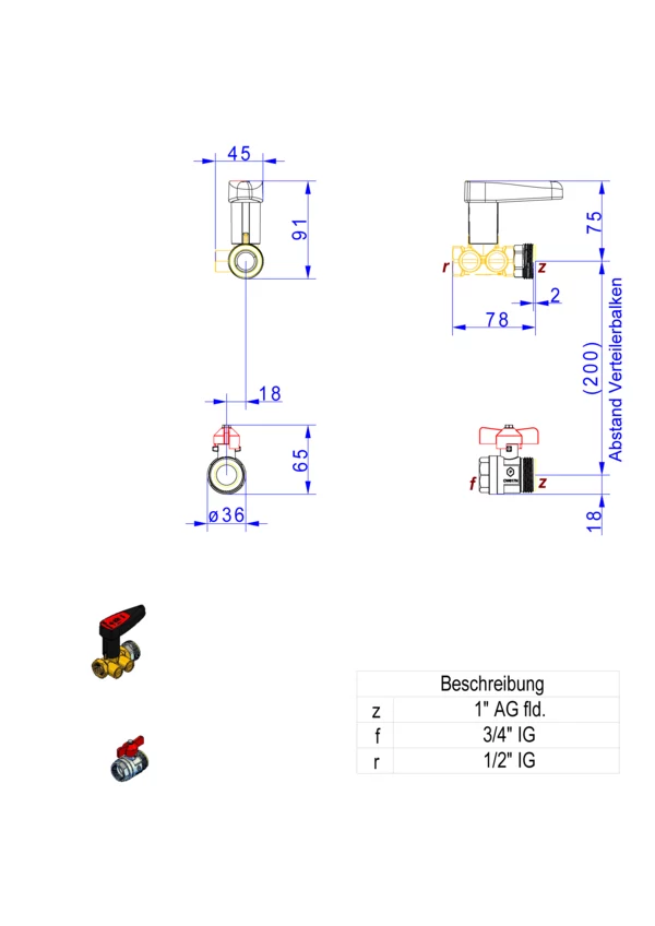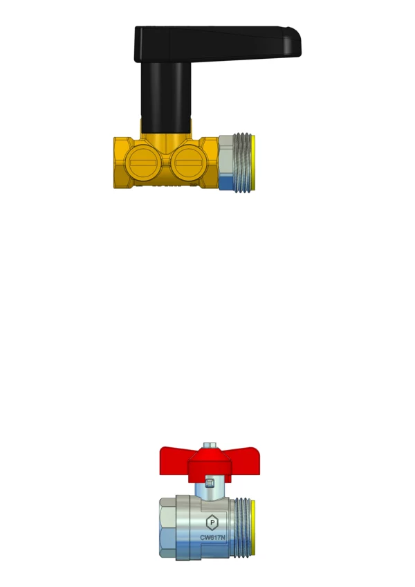 Anschlussgarnitur ohne Wärmezählerverrohrung, bestehend aus Vorlaufkugelhahn und absperrbares Strangregulierventil im Rücklauf, für den horizontalen Primäranschluss von Flächenheizungs- und Heizkörper-Anschlussverteilern. Über das Strangregulierventil ist ein manueller hydraulischer Abgleich des Verteilers vom Heizungssystem gegeben.