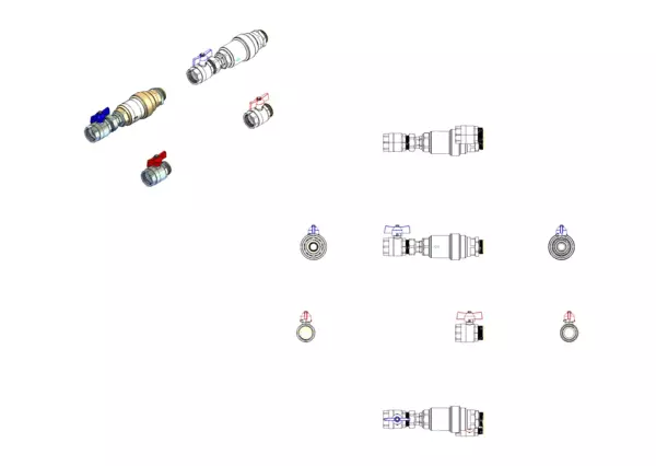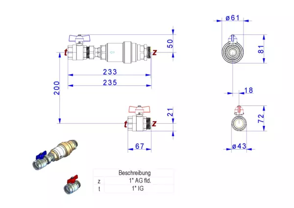 Anschlussgarnitur ohne Wärmezählerverrohrung, bestehend aus Vor- und Rücklaufkugelhahn und automatischen Volumenstrombegrenzer im Rücklauf, für den horizontalen Primäranschluss von Flächenheizungs- und Heizkörper-Anschlussverteilern. Über den automatischen Volumenstrombegrenzer ist ein automatischer hydraulischer Abgleich des Verteilers vom Heizungssystem gegeben.