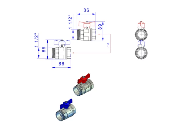 • Flügelgriff, blau für Rücklauf bzw. rot für Vorlauf
