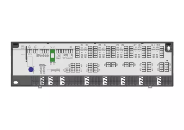 Elektrischer Verteiler, H/K, 10-Kanäle, 230 V zur Verteilung der Spannungsversorgung der Stellsignale und eines gemeinsamen Zeitprogramms für Raumgeräte (analog oder mit Display) und thermische Antriebe. Zur einfachen Verkabelung von bis zu 10 Zonen eines Flächenheizungs-/ kühlungssystems. Pumpenlogik zur Ansteuerung der Umwälzpumpe.