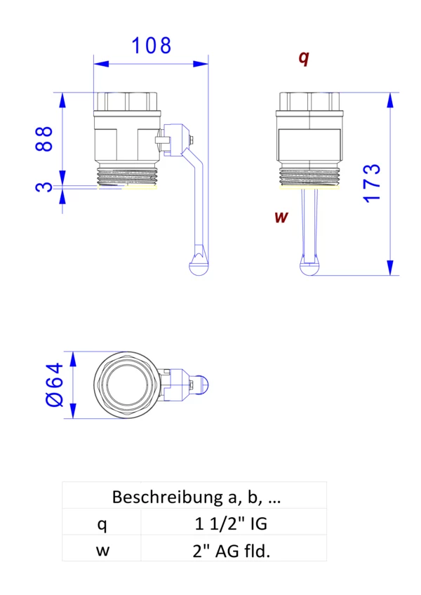 strawa Kugelhahn 1 1/2''IG x 2''AG flachdichtend ,langen Handgriff blau,BxHxT: 173 x 108 x 64 mm