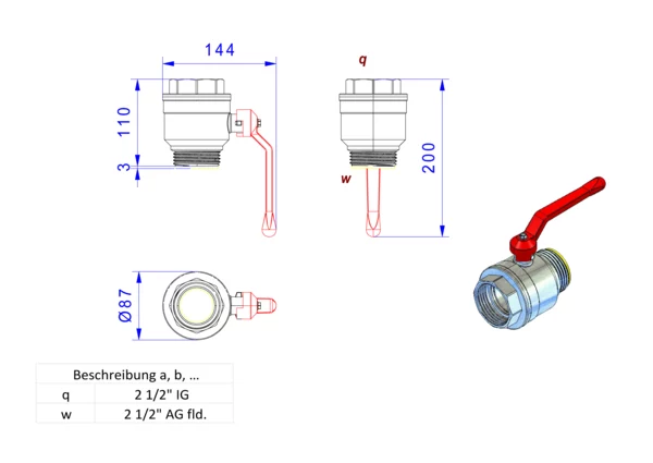 strawa Kugelhahn 2''IG x 2''AG fld. langen Handgriff rot,BxHxT: 173 x 108 x 64 mm