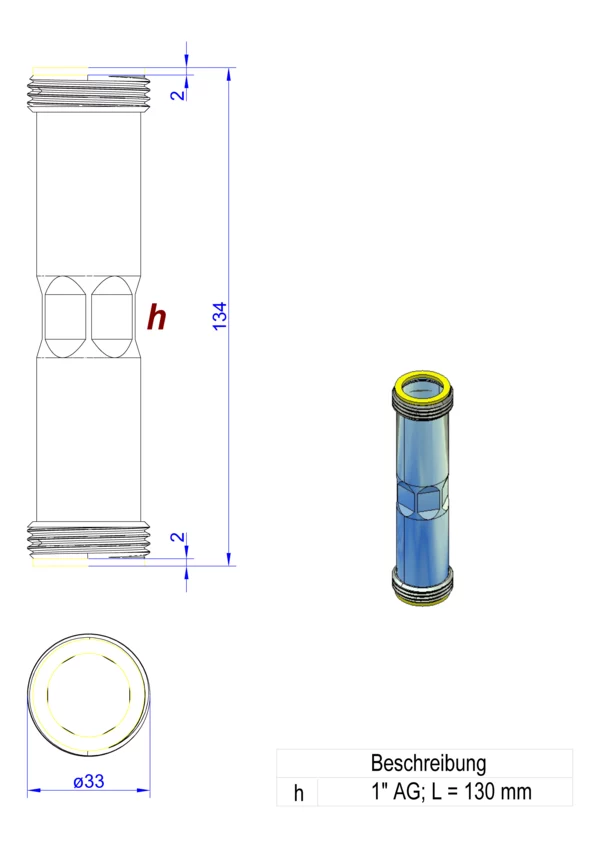• Distanzrohr 1" AG flachdichtend mit Länge 130 mm aus Edelstahl 1.4301