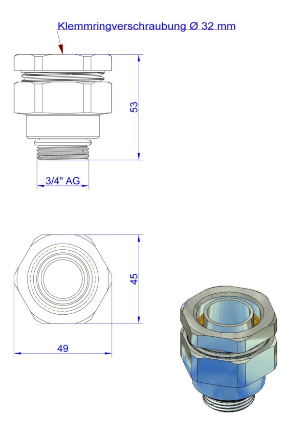 strawa Klemmverschraubung KLV 3/4'' AG x 32 V2A,BxHxT: 49 x 50 x 49 mm