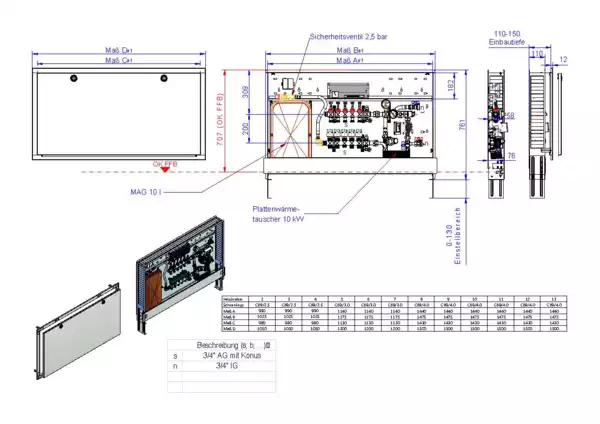 • Sicherheitsventil DN 15 2,5 bar und Membranausdehnungsgefäß (MAG) über Panzerschlauch am Rücklaufbalken montiert, Position des MAG links neben dem Verteiler