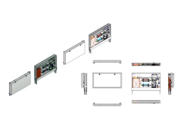 Die Regelstation für Flächenheizung ist mit einer Systemtrennung und einer Festwertregelung 20-50 °C ausgestattet. Die im Unterputzschrank montierte Regelgruppe umfasst eine Umwälzpumpe, einen Edelstahlverteiler mit absperrbaren Durchflussanzeigern und Ventileinsätzen für EGO-Schnellverschluss, sowie eine vertikale Anschlussgarnitur mit Wärmezählerverrohrung. Zusätzlich ist eine Wasserzählereinbaustrecke für Trinkwasser kalt vorhanden. Es gibt Platzhaltungen für eine Klemmleiste und EGO-Rgelantriebe.