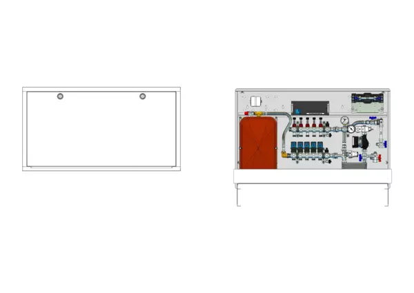 Die Regelstation für Flächenheizung ist mit einer Systemtrennung und einer Festwertregelung 20-50 °C ausgestattet. Die im Unterputzschrank montierte Regelgruppe umfasst eine Umwälzpumpe, einen Edelstahlverteiler mit absperrbaren Durchflussanzeigern und Ventileinsätzen für EGO-Schnellverschluss, sowie vertikale Anschlussgarnitur mit Wärmezählerverrohrung. Zusätzlich ist eine Wasserzählereinbaustrecke für Trinkwasser kalt vorhanden. Die vormontierten und verdrahteten EGO-Regelantriebe sind auf einer montierten Klemmleiste installiert.