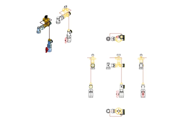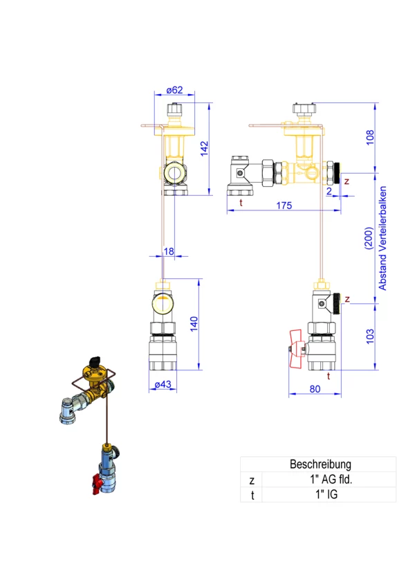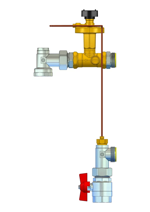 Anschlussgarnitur ohne Wärmezählerverrohrung, bestehend aus Vorlaufkugelhahn, Winkelstücken mit zusätzlichem Stopfen und absperrbarem Differenzdruckregler im Rücklauf, für den vertikalen Primäranschluss von Flächenheizungs- und Heizkörper-Anschlussverteilern. Über den Differenzdruckregler ein automatischer hydraulischer Abgleich des Verteilers vom Heizungssystem gegeben.