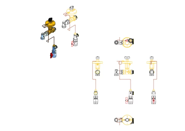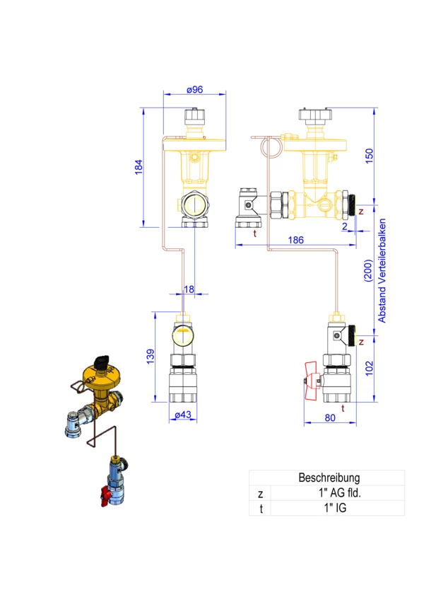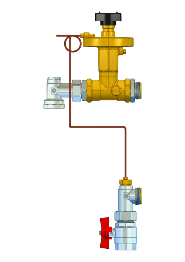 Anschlussgarnitur ohne Wärmezählerverrohrung, bestehend aus Vorlaufkugelhahn, Winkelstücken mit zusätzlichem Stopfen und absperrbarem Differenzdruckregler im Rücklauf, für den vertikalen Primäranschluss von Flächenheizungs- und Heizkörper-Anschlussverteilern. Über den Differenzdruckregler ein automatischer hydraulischer Abgleich des Verteilers vom Heizungssystem gegeben.