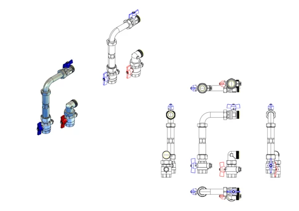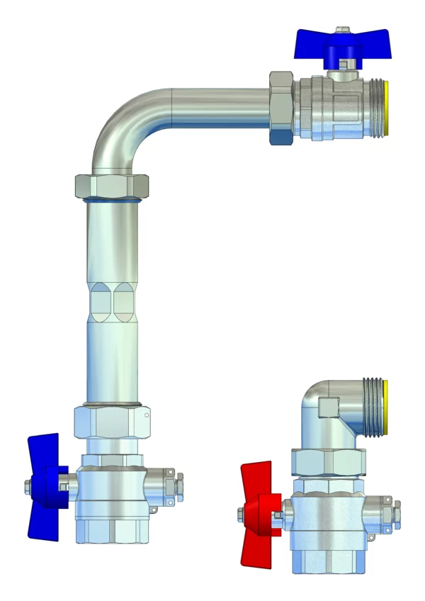 Anschlussgarnitur mit Wärmezählerverrohrung, bestehend aus Vor- und Rücklaufkugelhahn mit Fühlereinbaustück 5-5,2 mm M10x1, zweiter Rücklaufkugelhahn, Wärmezählerdistanzstück und langem Winkelanschlusstückel, für den vertikalen Primäranschluss von Flächenheizungs- und Heizkörper-Anschlussverteilern.