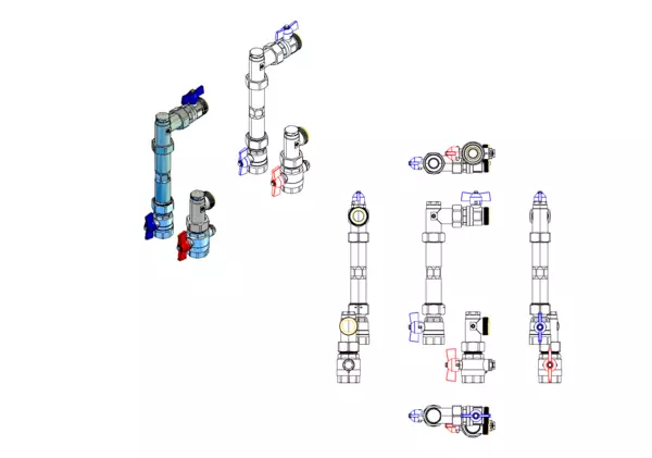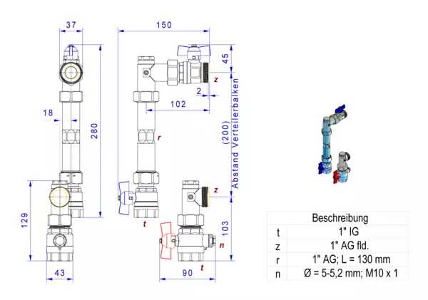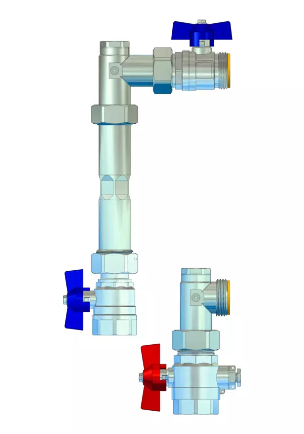 Anschlussgarnitur mit Wärmezählerverrohrung, bestehend aus Vorlaufkugelhahn mit Fühlereinbaustück 5-5,2 mm M10x1, zwei Rücklaufkugelhähnen, Wärmezählerdistanzstück und Winkelanschlusstücken mit Stopfen, für den vertikalen Primäranschluss von Flächenheizungs- und Heizkörper-Anschlussverteilern.