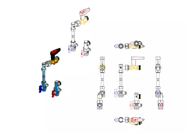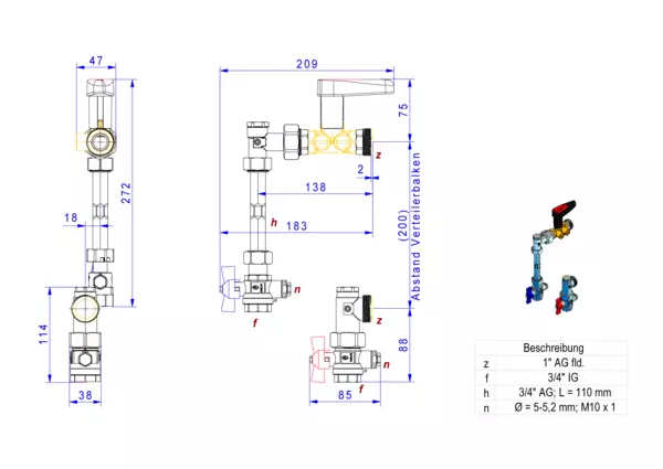 Anschlussgarnitur mit Wärmezählerverrohrung, bestehend aus Vor- und Rücklaufkugelhahn mit Fühlereinbaustück 5-5,2 mm M10x1, Strangregulierventil Ballorex Vario DN 15 für den manuellen hydraulischen Abgleich im Rücklauf montiert, Wärmezählerdistanzstück und Winkelanschlusstücken mit Stopfen, für den vertikalen Primäranschluss von Flächenheizungs- und Heizkörper-Anschlussverteilern.