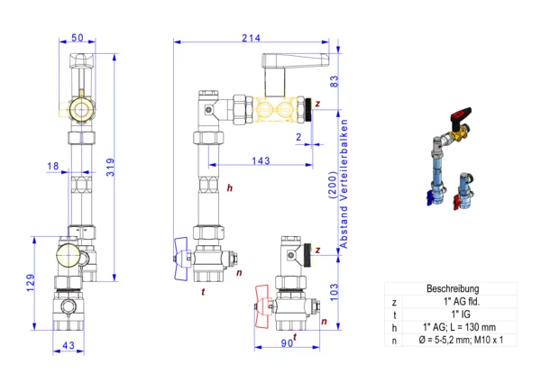 Anschlussgarnitur mit Wärmezählerverrohrung, bestehend aus Vor- und Rücklaufkugelhahn mit Fühlereinbaustück 5-5,2 mm M10x1, Strangregulierventil Ballorex Vario DN 20 für den manuellen hydraulischen Abgleich im Rücklauf montiert, Wärmezählerdistanzstück und Winkelanschlusstücken mit Stopfen, für den vertikalen Primäranschluss von Flächenheizungs- und Heizkörper-Anschlussverteilern.