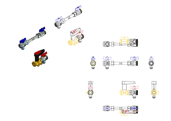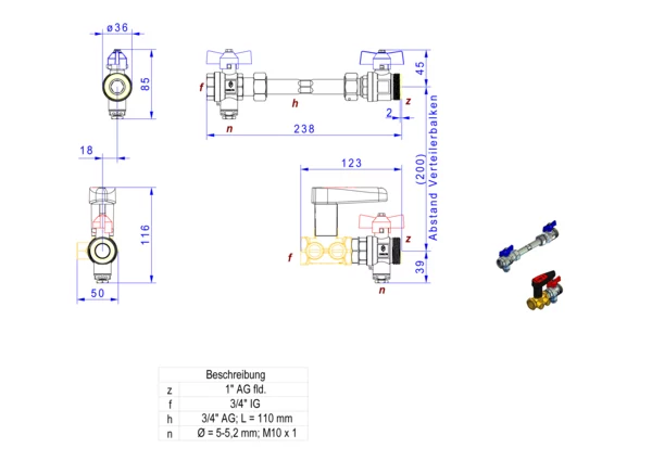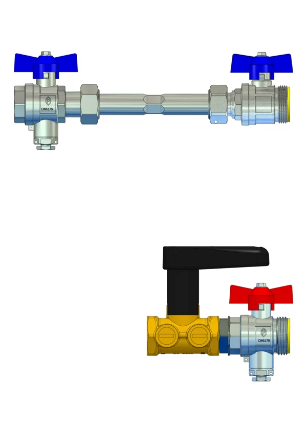 Anschlussgarnitur mit Wärmezählerverrohrung, bestehend aus Vor- und Rücklaufkugelhahn mit Fühlereinbaustück 5-5,2 mm M10x1, zweitem Rücklaufkugelhahn und Wärmezählerdistanzstück, für den vertikalen Primäranschluss von Flächenheizungs- und Heizkörper-Anschlussverteilern. Zusätzlich ist im Vorlauf ein Strangregulierventil Ballorex Vario DN 20 für den manuellen hydraulischen Abgleich montiert.