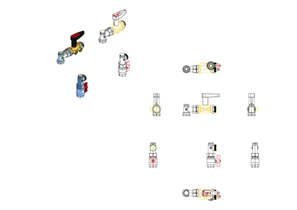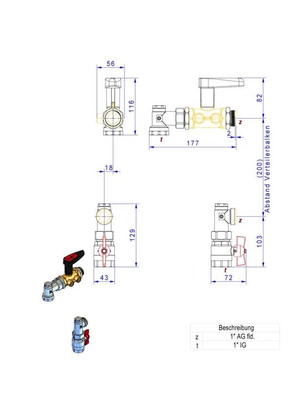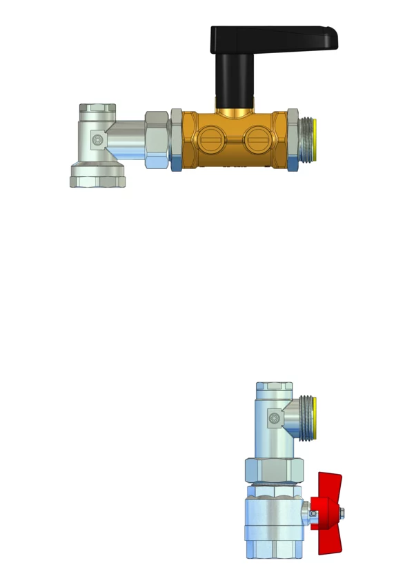 Anschlussgarnitur ohne Wärmezählerverrohrung, bestehend aus Vorlaufkugelhahn, Winkelstücken mit zusätzlichem Stopfen und absperrbarem Strangregulierventil im Rücklauf, für den vertikalen Primäranschluss von Flächenheizungs- und Heizkörper-Anschlussverteilern. Über das Strangregulierventil ist ein manueller hydraulischer Abgleich des Verteilers vom Heizungssystem gegeben.