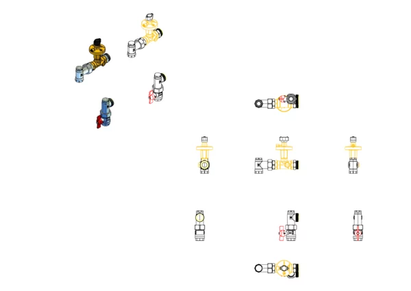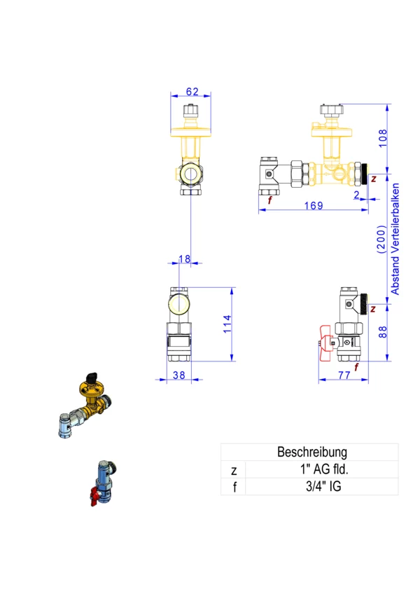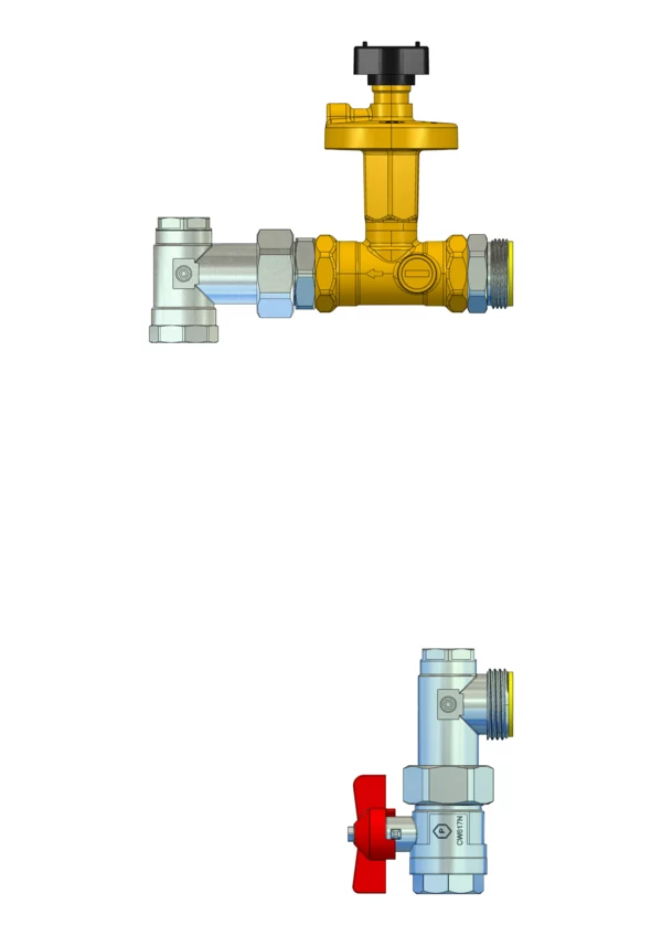 Anschlussgarnitur ohne Wärmezählerverrohrung, bestehend aus Vorlaufkugelhahn, Winkelstücken mit zusätzlichem Stopfen und absperrbarem Differenzdruckregler im Rücklauf, für den vertikalen Primäranschluss von Flächenheizungs- und Heizkörper-Anschlussverteilern. Über den Differenzdruckregler ein automatischer hydraulischer Abgleich des Verteilers vom Heizungssystem gegeben.