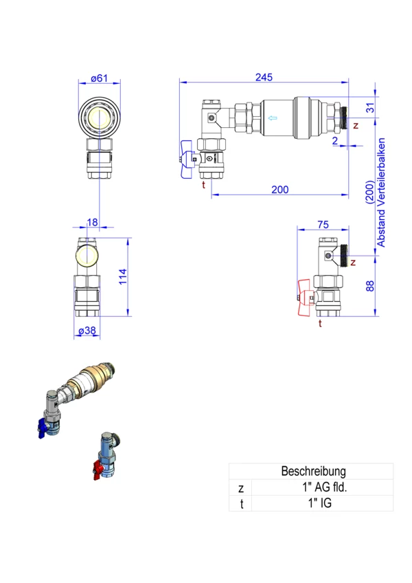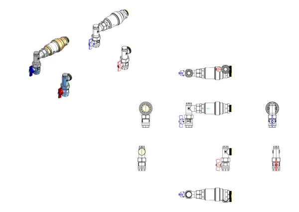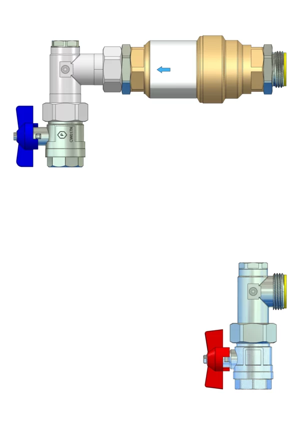 Anschlussgarnitur ohne Wärmezählerverrohrung, bestehend aus Vor- und Rücklaufkugelhahn, Winkelstücken mit zusätzlichem Stopfen und automatischem Volumenstromregler im Rücklauf, für den vertikalen Primäranschluss von Flächenheizungs- und Heizkörper-Anschlussverteilern. Über den Volumenstromregler ist ein automatischer hydraulischer Abgleich des Verteilers vom Heizungssystem gegeben.