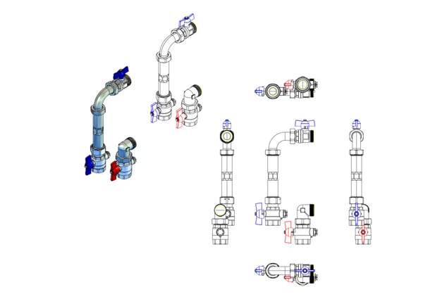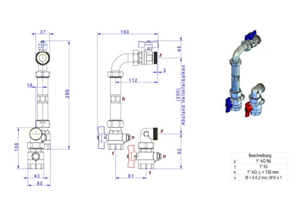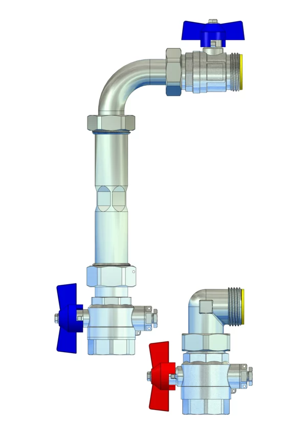 Anschlussgarnitur mit Wärmezählerverrohrung, bestehend aus Vor- und Rücklaufkugelhahn mit Fühlereinbaustück 5-5,2 mm M10x1, zweiter Rücklaufkugelhahn, Wärmezählerdistanzstück und Winkelanschlusstücken, für den vertikalen Primäranschluss von Flächenheizungs- und Heizkörper-Anschlussverteilern.