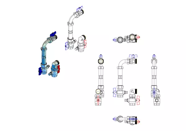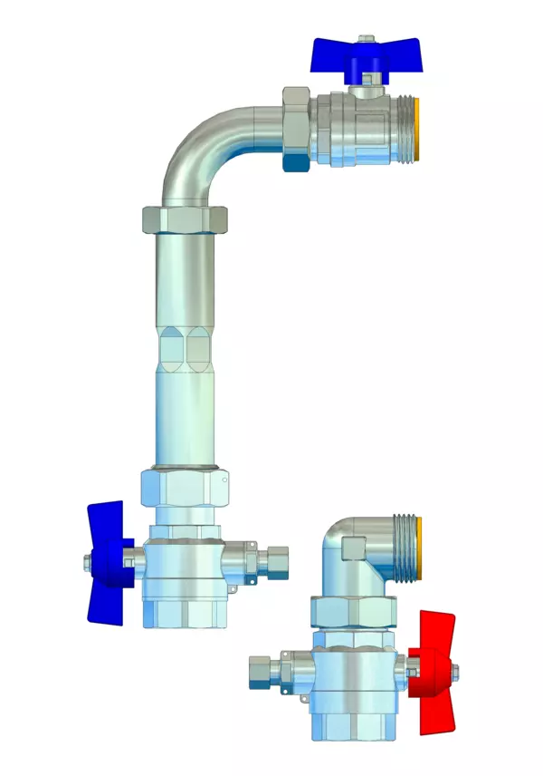 Anschlussgarnitur mit Wärmezählerverrohrung, bestehend aus Vor- und Rücklaufkugelhahn mit Fühlereinbaustück 6 mm M12x1, zweiter Rücklaufkugelhahn, Wärmezählerdistanzstück und Winkelanschlusstücken, für den vertikalen Primäranschluss von Flächenheizungs- und Heizkörper-Anschlussverteilern.