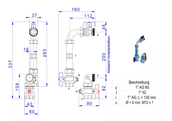 mit Wärmezählerverrohrung, Primäranschluss vertikal, mit Distanzstück 1" 130 mm, 1" Kugelhahn mit Fühlereinbaustück 6mm M12x1 im Vorlauf und Rücklauf, zusätzlich 1" Kugelhahn im Rücklauf