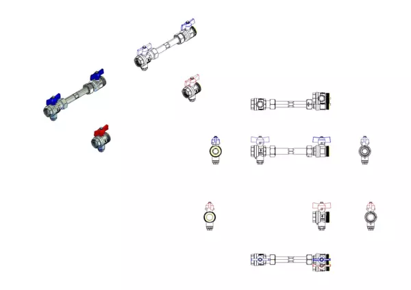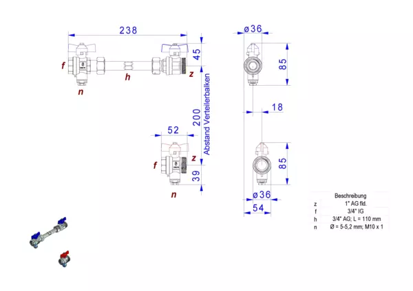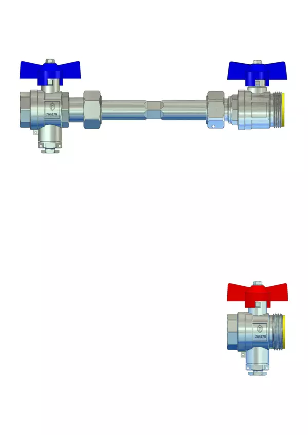 Anschlussgarnitur mit Wärmezählerverrohrung, bestehend aus Vor- und Rücklaufkugelhahn mit Fühlereinbaustück 5-5,2 mm M10x1, zweitem Rücklaufkugelhahn und Wärmezählerdistanzstück, für den vertikalen Primäranschluss von Flächenheizungs- und Heizkörper-Anschlussverteilern.