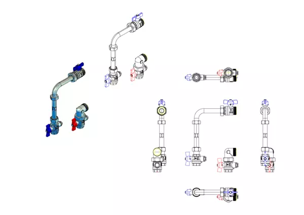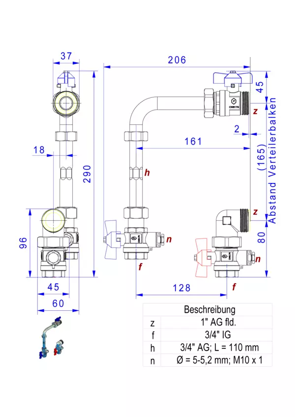 Anschlussgarnitur mit Wärmezählerverrohrung, bestehend aus Vor- und Rücklaufkugelhahn mit Fühlereinbaustück 5-5,2 mm M10x1, zweitem Rücklaufkugelhahn, Wärmezählerdistanzstück und langen Winkelanschlusstücken, für den vertikalen Primäranschluss von Flächenheizungs- und Heizkörper-Anschlussverteilern.
