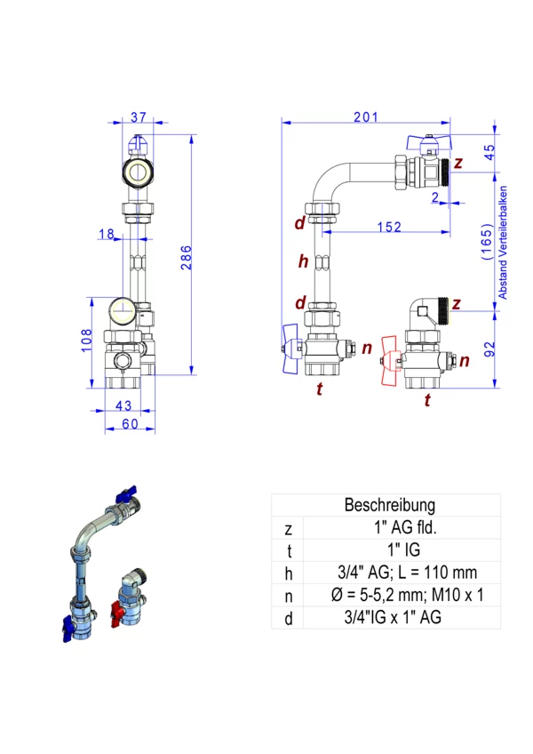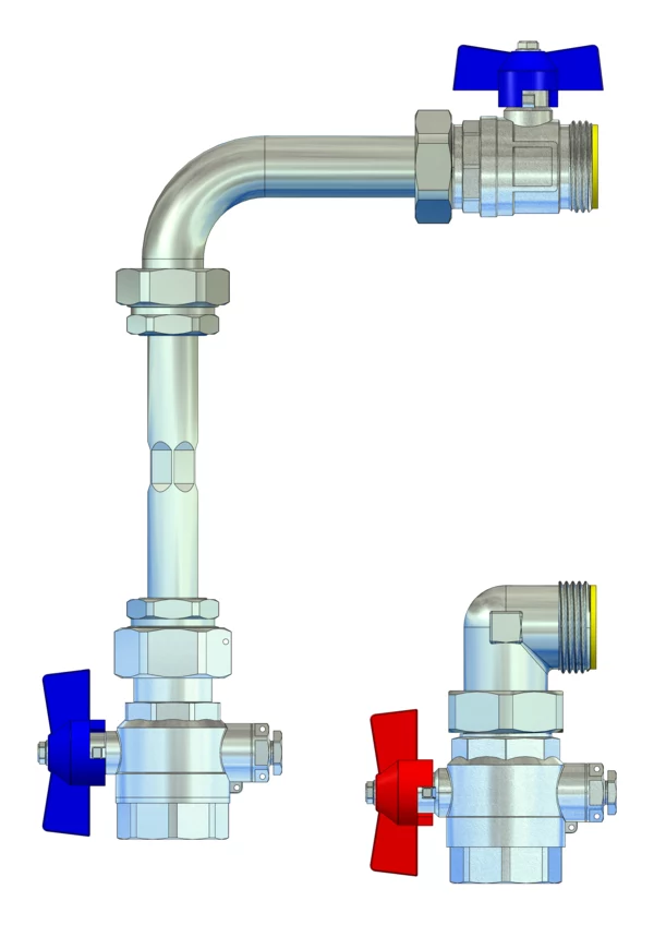 Anschlussgarnitur mit Wärmezählerverrohrung, bestehend aus Vor- und Rücklaufkugelhahn mit Fühlereinbaustück 5-5,2 mm M10x1, zweiter Rücklaufkugelhahn, variablen Wärmezählerdistanzstück und langen Winkelanschlusstücken, für den vertikalen Primäranschluss von Flächenheizungs- und Heizkörper-Anschlussverteilern.