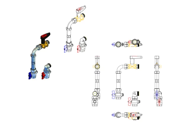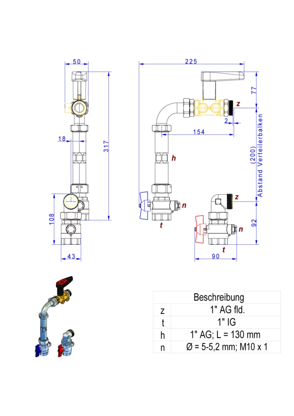 Anschlussgarnitur mit Wärmezählerverrohrung, bestehend aus Vor- und Rücklaufkugelhahn mit Fühlereinbaustück 5-5,2 mm M10x1, Strangregulierventil Ballorex Vario DN 20 für den manuellen hydraulischen Abgleich im Rücklauf montiert, Wärmezählerdistanzstück und Winkelanschlusstücken, für den vertikalen Primäranschluss von Flächenheizungs- und Heizkörper-Anschlussverteilern.