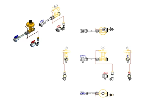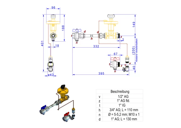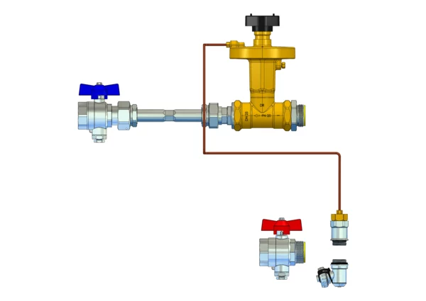 Anschlussgarnitur mit Wärmezählerverrohrung, bestehend aus Vor- und Rücklaufkugelhahn mit Fühlereinbaustück 5-5,2 mm M10x1, Differenzdruckregler Ballorex Delta DN25, Differenzdruck einstellbar von 50-250 mbar, und variables Wärmezählerdistanzstück, für den vertikalen Primäranschluss von Flächenheizungs- und Heizkörper-Anschlussverteilern.