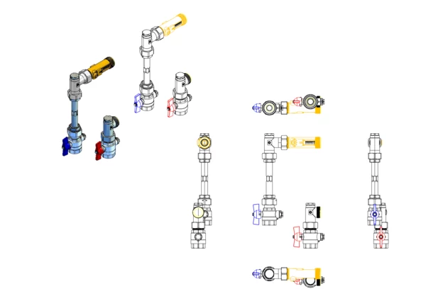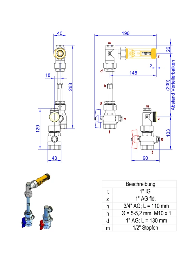 Anschlussgarnitur mit Wärmezählerverrohrung, bestehend aus Vor- und Rücklaufkugelhahn mit Fühlereinbaustück 5-5,2 mm M10x1, Durchflussmesser 10-40 l/min mit hydraulischen Abgleich im Rücklauf montiert, variables Wärmezählerdistanzstück und Winkelanschlusstücken mit Stopfen, für den vertikalen Primäranschluss von Flächenheizungs- und Heizkörper-Anschlussverteilern.