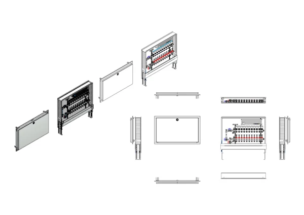 vertikale Anschlussgarnitur mit Wärmezählerverohrung, Verteiler mit Durchflussanzeiger 0-3 l/min im Vorlaufbalken und Thermostatventileinsatz M30x1,5 im Rücklaufbalken, vormontierte Stellantriebe und Klemmleiste mit Vorverdrahtung, Standard-Unterputz-Schrank mit Frontblende in RAL 9016