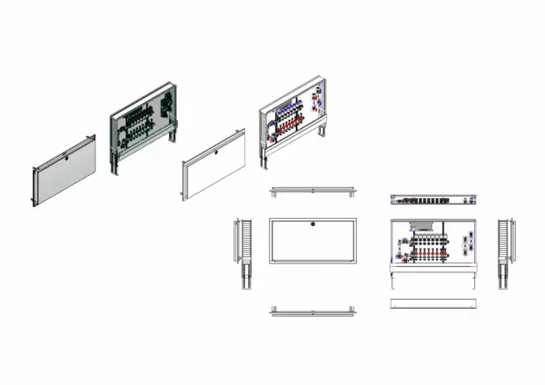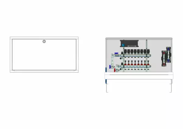 vertikale Anschlussgarnitur mit Wärmezählerverohrung, Verteiler mit Durchflussanzeiger 0-3 l/min im Vorlaufbalken und Thermostatventileinsatz M30x1,5 im Rücklaufbalken, vormontierte Stellantriebe und Klemmleiste mit Vorverdrahtung, Wasserzählerstrecken Trinkwasser kalt und warm, Standard-Unterputz-Schrank mit Frontblende in RAL 9016